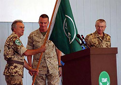 Supreme Allied Commander, Europe Gen. James Jones (C) hands over the ISAF flag he received from Commander of ISAF-III Lt. Gen. Norbert Van Heyst of Germany, right, to Lt. Gen. Gotz F.E. Gliemeroth during a handover ceremony in Kabul, Afghanistan Aug. 11, 2003. NATO took command of the 5,000-strong international peacekeeping force in the Afghan capital on Monday, a historic move that marks the alliance's first operation outside Europe since it was created 54 years ago. [AP]
