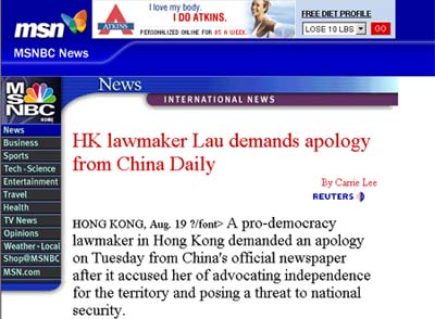 'Apology should come from Emily Lau' ( 2003-08-22 11:54) (China Daily HK Edition)