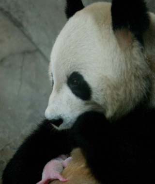 A newborn giant panda cub, weighing 180 grams, leans close to her mother August 26, 2003 in Beijing Zoo. Eight-year-old Niu Niu gave birth to the cub, her first, on Sunday. [newsphoto.com.cn]