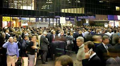 Commuters gather at London Bridge Station in central London during a power outage, Aug 28, 2003. A half-hour power cut paralyzed London with up to half a million commuters trapped in travel chaos that hit the evening rush hour.   [Reuters]