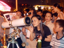 Planetariums and astronomical organizations in China organized various activities for astronomy fans to observe the occasion, which has not taken place for 60,000 years. In Beijing and Shanghai, residents, old and young, took to observatories and open suburban areas to observe the planet under the guidance of astronomers from local observatories. Stargazers in Nanjing city, capital of Jiangsu province in east China, were provided an optical telescope by the observatory on Zijinshan, or the Purple Mountain, to catch a good sight of Mars. Lectures on Mars were also given by astronomers and veteran astronomy fans around the country, whose audiences were mostly made up of primary and high school students. Prof. Zhang Mingchang, former secretary general of the Jiangsu Astronomical Academy, said that he has never before had audiences so interested in Mars and astronomy. Astronomical telescopes and publications on the subject have also become parents' choice for gifts to their children. Despite the growing enthusiasm, some experts acknowledged, the country still lags behind the world in astronomy research. The observatories and astronomical facilities cannot meet the research demands. What's more, they noted, China is in great need of astronomers. Though Sanya, capital of the island province of Hainan in South China, boasted the most favorable observation location in the country and drew hundreds of astronomers and amateurs Wednesday night, the province still does not have its own astronomy research institutions. The world witnessed a new round of competition in Mars exploration this year when the European Space Agency (ESA) and theNational Aeronautics and Space Administration (NASA) of the UnitedStates successively sent Mars Express and a pair of Mars Exploration Rovers -- Spirit and Opportunity -- into space to collect more information and data for their Mars exploration plans. However, China has not taken part in the competition. The Chinese nation is, however, taking steps with its own moon-landing plan and plans for preliminary research on Mars exploration. Though Westerners in the past had a keen interest in finding Martians, Xinhe, a well-known science fiction writer in China, observes that Chinese people seem to be more interested in the moon. In China, a popular legend about Chang'e, or the beautiful and graceful Goddess flying to the Moon, has been passed down from generation to generation. "The different interests might be a result of cultural diversity or different locations in observation," the writer says. "But the emerging interest Chinese people have shown in Mars, Ithink, is somewhat an indication that Chinese people are looking much farther than before," he said.