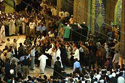 Shiite Muslims in Karbala, Iraq's second holiest city, 80 kilometers east of Baghdad, Aug 31, 2003, carry the symbolic coffin of the leader of the supreme council for the Islamic revolution in Iraq, Ayatollah Mohammed Baqir al-Hakim after his car was bombed at the mosque in Najaf, 177 kilometers from Baghdad.   [AP]