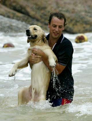A man saves a dog from drowning at a beach as typhoon Dujuan approaches Hong Kong, September 2, 2003. [Reuters]