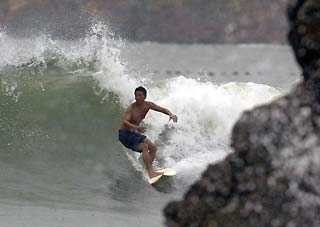 A surfer on a Hong Kong beach take advantage of storm-whipped waves as typhoon Dujuan advances toward Hong Kong, Tuesday, September 2, 2003. [newsphoto.com.cn]