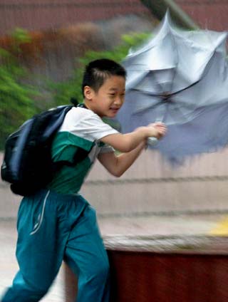 A boy struggles with his umbrella in Guangzhou, capital of South China's Guangdong province, September 2, 2003 as Typhoon Dujuan brings pounding rain and howling winds. Dujuan, the 13th typhoon hit China this year, slammed into the southern Chinese coastal city of Shenzhen, killing at least 20 people and causing extensive damage to parts of the country's economic development zone. [newsphoto.com.cn]