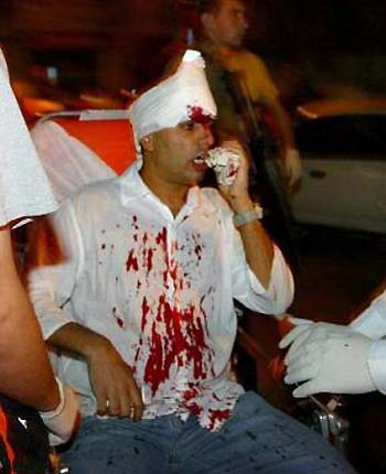An Israeli woman who was injured in an explosion at a cafe receives help in Jerusalem Sept10, 2003. Palestinian suicide bombers killed at least 13 people in two separate attacks just hours apart in Israel on Tuesday, hitting back hard after a wave of Israeli air strikes against Islamic militants. A bomber killed at least six people in a cafe in Jerusalem just over five hours after a bombing killed seven people at a bus stop outside a military base near Tel Aviv, dealing two shattering blows to a collapsing U.S.-backed peace plan.   [Reuters]