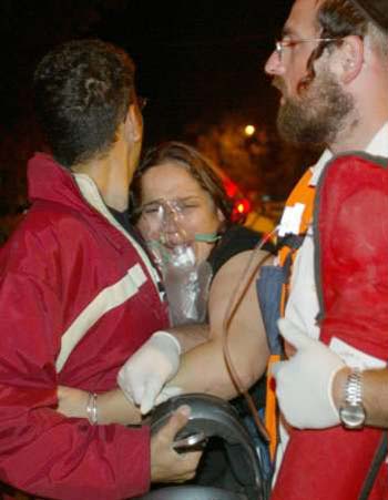 A wounded Israeli youth is wheeled by paramedics to an ambulance away from the scene of a suicide bombing at a Jerusalem cafe, late Tuesday Sept. 9, 2003. A suicide bomber blew up outside the cafe in Jerusalem Tuesday night, killing at least six people and wounding about 40 others, witnesses and rescue workers said.   [AP]
