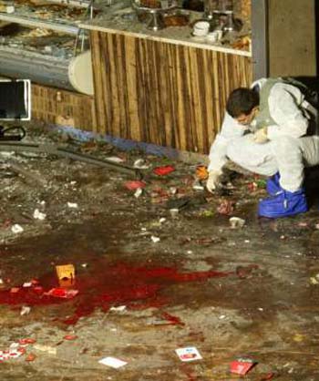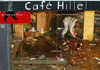 An Israeli policeman search through the debris of a destroyed cafe after an explosion in Jerusalem Sept 10, 2003.  [Reuters]