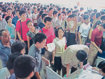 Applicants queue at a recruitment exercise for civil servants in Shangdong. Both college graduates and rural-residency holders are welcome to apply for positions at county-level governments. [newsphoto.com.cn]