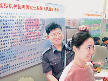 A police officer measures the height of an applicant during a recruitment for civil servants in Shandong Province. [newsphoto.com.cn]