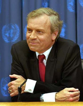 The Foreign Minister of the Netherlands, Jaap G. de Hoop Scheffer, speaks to reporters following a news conference during the United Nations General Assembly special session on HIV /AIDS at U.N. headquarters in New York, Sept. 22, 2003.  [Reuters]