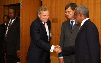 United Nations Secretary-General Kofi Annan (R) shakes hands with Dutch Foreign Minister Jaap De Hoop Scheffer as Dutch Prime Minister Dr. Jan Peter Balkenende watches at U.N. headquarters, Sept. 22, 2003. De Hoop Scheffer has been named new NATO Secretary-General. Security guards are seen at left.   [AP]