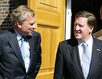 FILE - NATO Secretary General Lord George Robertson (R) and Dutch Foreign minister Jaap de Hoop Scheffer (L) are seen during his farewell visit to the Netherlands, in The Hague, on Sept. 8, 2003. NATO selected de Hoop Scheffer as the alliance's new Secretary-General Sept. 22, 2003, picking a diplomat-turned-politician who's well placed ease tensions between the United States and key European allies in the wake of the Iraq war.  [AP]