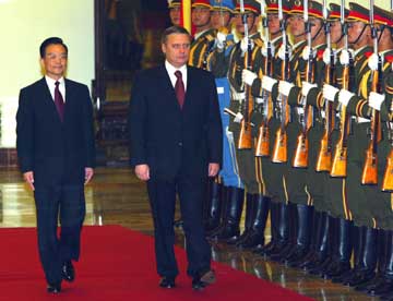 Premier Wen Jiabao and Russian Prime Minister Mikhail Kasyanov review the honour guard at yesterday's ceremony in Beijing to open Kasyanov's official state visit to China. During their meeting the two leaders agreed to further expand trade ties between the two countries. [newsphoto.com.cn]