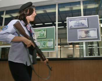 A guard patrols as new Iraqi dinar banknotes