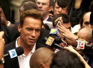 Hollywood action hero Arnold Schwarzenegger is swarmed by the media after he voted in Pacific Palisades, Calif., Tuesday, October 7, 2003. Exit polls indicated Arnold Schwarzenegger was leading the field of candidates to replace Californians banished Gray Davis in his recall election.  [AP]
