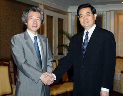 Chinese President Hu Jintao (right) shakes hands with Japanese Prime Minister Junichiro Koizumi prior to their bilateral talks on the sidelines of the Asia-Pacific Economic Cooperation (APEC) summit in Bangkok, October 20, 2003. Pacific Rim nations have agreed to join forces to dismantle transnational terrorist groups that threaten their economies and to push for swift progress in stalled world trade talks, their final draft communique said. [Reuters]