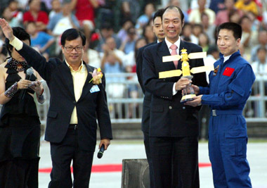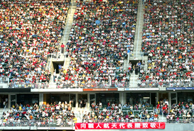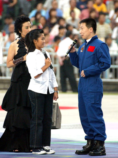 China's first astronaut Yang Liwei and Hong Kong film star Jackie Chan sing a song named "A man should strive to improve himself constantly" at the Hong Kong Stadium November 1, 2003. The stadium became a sea of red flags and flowers as 40,000 people came to meet Yang. At the invitation of the HK Special Administrative Region government, the 38 year-old astronaut arrived with the delegation of China's First Manned Space Mission Friday night. [newsphoto.com.cn]