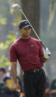 Tiger Woods reacts to his second shot on the third hole during the final round of the Tour Championship at Champions Golf Club, Sunday, Nov. 9, 2003, in Houston. [AP]