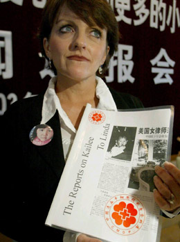 Linda Wells, an American mother of a child adopted from China, appeals to the public in Beijing yesterday to help her seriously ill daughter Kailee find a bone marrow match. [China Daily]