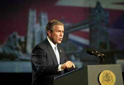 In a speech in London on Wednesday, Bush toughened his stance over the barrier, saying Israel must not prejudice final peace negotiations "with the placement of walls and fences."