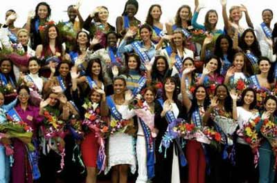 Miss World contestants wave after arriving to the seaside resort of Sanya in Hainan Island November 22, 2003 after touring several Chinese cities to promote the contest. The 53rd Miss World contest on December 6. [Reuters]