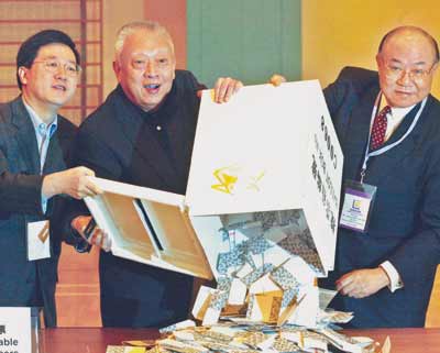 Hong Kong Chief Executive Tung Chee-hwa (centre), Electoral Affairs Commission Chairman Woo Kwok-hing (right) and Secretary for Constitutional Affairs Stephen Lam open a ballot box at a polling station at Happy Valley constituency Sunday night after voting ended at 10:30 pm. Tung said he was proud that 1.06 million voters cast their ballots, representing a turnout of 44 per cent, both figures setting a record. [newsphoto.com.cn]