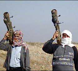 Picture dated 06 Nov.2003 shows two masked anti-coalition fighters holding SA-14 surface-to-air missiles in an unidentified location south of Baghdad. Handout photo from Le Nouvel Observateur.  [AFP]