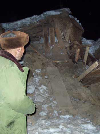 An old man looks at the debris of a house following an earthquake December 1, 2003 in Northwest China's Xinjiang Uygur Autonomous Region. The quake, measuring 6.1 on the Richter Scale, killed 11 people and injured 17 others in Zhaosu County near the China-Kazakhstan border. About 800 homes were leveled and another 200 were on the verge of collapse. [newsphoto.com.cn]