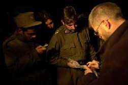 Afghan police officers examine a piece of shrapnel after a rocket exploded in a field about 300 yards from the U.S. Embassy in Kabul, Afghanistan, Thursday, Dec. 4, 2003. No injuries were reported, said Kabul military commander Mohammed Ayub Salangi, as police and soldiers searched the area with flashlights. They found a piece of shrapnel that appeared to come from a truck-launched rocket, he said. [Reuters]