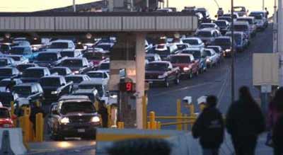 Commuters drive back from Juarez through the Bridge of the Americas port of entry in El Paso, Texas, Tuesday, Jan. 6, 2004. U.S. President Bush wants to give legal status to foreign workers who obtain jobs in the United States as well as the millions of illegal immigrants already working in the country. [AP Photo]