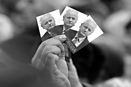 A supporter of the late Slobodan Milosevic holds up pictures of the former Serbian president on Thursday. (REUTERS)