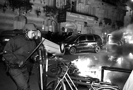 Flames erupt from a torched car and motorbike on a street facing Sorbonne University, during clashes between youths and gendarmes after a student protest against the First Employment Contract on Thursday. (REUTERS)