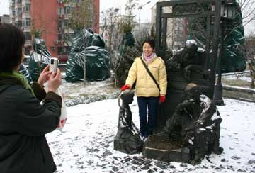 Hollowday travelers are waiting outside the Beijing Railway Station on Sunday, January 11, 2004. A light snow arrives in the morning of Sunday which brings the capital of Beijing the white winter's joy. Reportedly this is the first snow in Beijing of the new year. [newsphoto.com.cn]