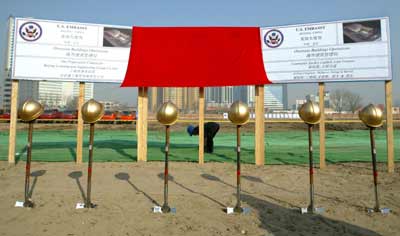A Chinese worker prepares a groundbreaking ceremony for the new U.S. embassy in Beijing on February 10, 2004. [Reuters]
