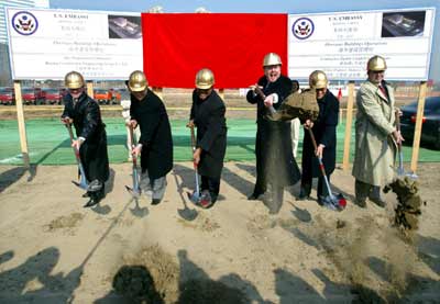 U.S. Ambassador to China Clark Randt (left) lifts the first spade of dirt at a groundbreaking ceremony for the new U.S. embassy in Beijing on February 10, 2004. The embassy is due to open for business before China's capital holds the Summer Olympic Games in 2008. [Reuters]