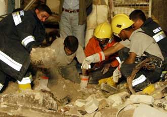 Iraqi rescuers comb the rubble of a house for buried victims after a bomb explosion at an adjacent hotel in central Baghdad March 17, 2004. [Reuters]