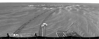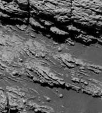 The rocks would be excellent preservers of biological signs, if life ever existed on Mars, Squyres said. That makes Meridiani Planum a prime target for future missions that would search for evidence of past biology. An ancient sea also implies that early Mars was warmer than today, said University of Colorado geologist Bruce Jakosky, who was not directly involved in the finding. And he said it suggests that any possible microbes on Mars would not have had to rely only on relatively inefficient subsurface, geochemical energy, but might have used direct sunlight as an energy source. "If it's surface water, that would allow the possibility of photosynthetic organisms," Jakosky said. "Once you can tap into sunlight, it leaves open the possibility for a much greater abundance of life if it was ever there." Scientists so far have no firm evidence that Mars was ever inhabited, however. Sedimentary signs The crucial clues that came together in recent days included the detection of chlorine and bromine, indicating a salty sea had evaporated over time, scientists said. Also significant were crisscrossing layers of sediment in the rock that revealed they formed beneath currents of moving water. Early interpretations of the same lines of research led to the previous discovery that the rocks were once soaked in water, but it wasn't clear if the water was present when the rocks formed, or if the water came later. Increased confidence in the bromine finding strengthened the case that the particles which formed the rocks had precipitated out of surface water, with salt concentrations that increased as the water evaporated. Some layers within the rock are at telltale angles to the main layers. Scientists call the patterns "crossbedding." Other features, called festooned layers, involve smile-shaped curves produced by shifting, rippled shapes of loose sediments under a current of water. The patterns indicate sediment the size of sand grains had bonded together into ripples in water that was at least 2 inches (5 centimeters) deep -- and possibly much deeper, said John Grotzinger, a rover science team member from the Massachusetts Institute of Technology. The water flowed at a rate somewhere between 4 and 20 inches every second (10 to 50 centimeters per second). That's up to about 1 mile an hour. "Ripples that formed in wind look different than ripples formed in water," Grotzinger said. The rocks may have been cast in a salt flat that was alternately wet and dry, Grotzinger added. Similar environments on Earth, at the edge of oceans or in desert basins, sometimes have currents of water that produce the type of ripples seen in the Mars rocks. Brighter prospects The discovery re-ignited enthusiasm over Mars as a potential well for biology, at least in the past. (Researchers are unsure whether any life that ever developed on Mars -- if it did -- could have endured into the present era, with Mars being cold and dry.) "The particular type of rock Opportunity is finding, with evaporite sediments from standing water, offers excellent capability for preserving evidence of any biochemical or biological material that may have been in the water," said Squyres, the rover mission's chief scientist. The discovery quite literally brightens the prospects for past life in another important way. Had the water been only subsurface, life would have had to rely on geochemical energy, such as the decay of rocks into methane. On Earth, dependence on geochemical energy is a limiting factor for underground microbes, said Jakosky, the University of Colorado geologist who is also director of the university's NASA-sponsored Center for Astrobiology. He helped pick the rover landing sites but has not been directly involved in the science explorations. Organisms that depend on geochemical energy are less diverse and of more limited scope than life that flourishes in sunlight, Jakosky explained. "This dramatic confirmation of standing water in Mars' history builds on a progression of discoveries about that most earthlike of alien planets," said Ed Weiler, NASA associate administrator for space science. "This result gives us impetus to expand our ambitious program of exploring Mars to learn whether microbes have ever lived there and, ultimately, whether we can." Most scientists agree that finding signs of past or present life will likely require sending a robot to bring back samples for study in laboratories on Earth. Meridiani Planum is, for now, the best destination for such a mission, which NASA has slated for launch sometime in the next decade. "Someday we must collect these rocks and bring them back to terrestrial laboratories to read their records for clues to the biological potential of Mars," said James Garvin, lead scientist for Mars and lunar exploration at NASA Headquarters. Hints at 'warm and wet' Mars Finding a sea on Mars also hints at the past climate. Scientists have been arguing for decades over whether Mars was once warm and wet or just wetter and cold. "I think that this seems to point toward Mars being warm enough and wet enough to allow standing water" in the distant past, Jakosky said. Jakosky also explained that Tuesday's announcement means the water was present as the sedimentary rock formed. The rocks are known to be from Mars' early epochs, so the water was likely there in the very, very distant history of the planet's roughly 4.5 billion years of existence. Had the new evidence pointed only to groundwater altering the chemistry of the rocks, such water might have coursed through the rocks at any time during the planet's history, including well after the rocks themselves were formed. Opportunity had spent its entire time on Mars, since landing in late January, inside a shallow crater studying soil and the exposed shelf of bedrock. The most recent and telling observations came by taking 152 microscopic pictures of a rock named Last Chance. The findings add to previous rover discoveries of hematite, a mineral typica