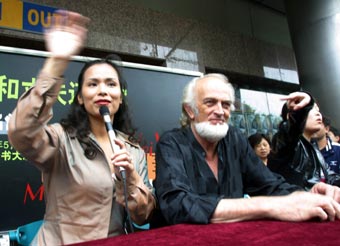 Weiwei, a famous pop singer in China,  waves at camera with her American husband Mr Michael Smith, a famous pianist composer, at a news conference. [file photo]