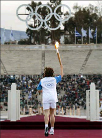With the flame roaring again, the priestess gave the torch to Nikolaou who again passed it on to Angelopoulos.