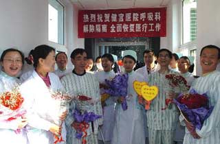 The respiratory disease wards with two hospitals in Beijing were announced to be lifted out of isolation on Thursday as no new cases of SARS infection have ever been found after two weeks' isolation. Flanked by flowers, 159 medical workers, in-patients and helpers, all smiling, unveiled face and walked out of the strictly quarantined sections at Jiangong Hospital and at Renmin Hospital affiliated to the Peking University.