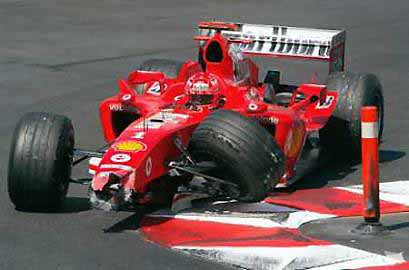 Schumacher's bid to become the first driver to win the first six races of a Formula One season ended with a wheel dangling from his damaged bright red Ferrari. It was the first race this season that Schumacher, a six-time champion, did not win. The victory was the first in 119 Grand Prix races for Trulli, who drives for Renault. Schumacher was following the safety car, which was on the circuit after Fernando Alonso of Renault crashed on Lap 42, when he was apparently bumped from behind by Juan Pablo Montoya of BMW-Williams. That shunted Schumacher into a barrier. The incident happened in the long tunnel of Monaco's narrow, twisting circuit, making it hard to see clearly what happened. But Trulli, who was behind, said Schumacher had braked to keep his tires warm just as Montoya accelerated. Ferrari's technical director, Ross Brawn, confirmed that account. Stewards met with Schumacher and Montoya after the race. "He was hit by Montoya from behind," Brawn said. "He was just warming up the brakes" for the restart. Schumacher limped into the pits, retiring for the first time since April 2003, at the Brazilian Grand Prix. He still leads the championship with 50 points earned from his perfect first five races. Trulli, 29, led at the start, keeping the advantage from the first pole position of his career. He held off a late surge from Jenson Button of BAR-Honda, who placed second. "It's amazing," said Trulli, ecstatic with his victory at the shortest but most glamorous circuit in Formula One. "I won in Monaco, the best race probably in the world." Schumacher's Ferrari teammate, Rubens Barrichello, placed third. He is still second in the driver standings, with 38 points. Button, Ferrari's strongest challenger this season, is third, with 32 points, followed by Trulli, with 31. Renault, also the last team to beat Ferrari, at the Hungarian Grand Prix in
