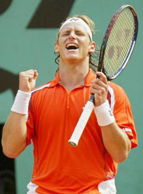The crowd gave Nalbandian a warm ovation, then raised the decibel level when Kuerten took a curtain call. "The fans were fantastic," Nalbandian said. "It's normal that they rooted for Guga because of what he represents to Paris." Playing in the first Grand Slam quarterfinal of his career, the 25-year-old Gaudio rose to the occasion with a nearly flawless performance. "I thought I was going to be really nervous," Gaudio said. "But, in fact, I was not at all." His biggest stumble came in the second game of the final set, when he slipped and fell chasing a shot and scraped his knee on the clay. Blood still trickled down his shin after the match, but his strokes were unaffected. The baseliner finished with 27 winners and just 19 errors, and he won 20 of 21 points at the net, playing serve-and-volley to close out two games. "He was too good," said Hewitt, who was seeded 12th. "He's very confident at the moment, especially on this surface, and his movements are as good as anyone on this surface." Gaudio won 11 consecutive points early in the second set to take control and needed less than two hours to complete the victory. He improved his career record in major events to 20-20.