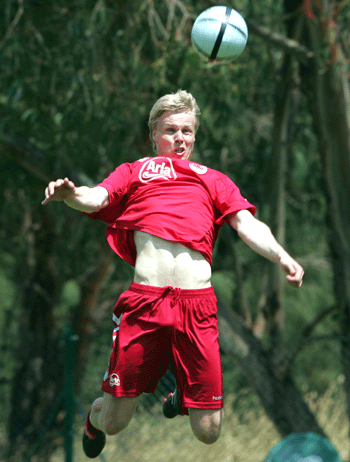 Denmark's Martin Laursen jumps for the ball during team's training session near Portimao June 10, 2004. Denmark will play their first match of the Euro 2004 soccer championships against Italy on June 14. [Reuters]