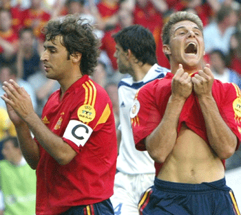 Initially, though, Spain settled first and dominated the match and Morientes' goal, his 23rd in his 35th international, was just reward for their superiority. Both teams were full of confidence after winning their opening matches but Spain's was boosted even more after Morientes struck. Raul, his former Real Madrid team mate, set up the goal after intercepting a loose ball from Michalis Kapsis on the edge of the box after 28 minutes. Raul, darting everywhere and causing the Greek defence problems throughout, back-heeled the ball to Morientes who cleverly made space, gliding past two defenders before powering a drive past Greek keeper Antonis Nikopolidis. Greece's goal came out of nothing when a long raking pass from the right by midfielder Vassilis Tsartas found striker Haristeas, who controlled the ball well and fired past goalkeeper Iker Casillas for the equaliser. The match ebbed and flowed between both penalty areas in an exciting second half. Raul, named man of the match, had a great chance to put Spain 2-0 ahead before Haristeas equalised but sent his free header high over the bar. In the main, though, Spain just about controlled the game and with defender Carles Puyol and midfielder David Albelda outstanding, Greece were largely restricted to speculative long-range efforts. Typical was a 30-metre drive from Greek skipper Theodoros Zagorakis which just flew past the post. Winger Joaquin was excellent for Spain after replacing Joseba Etxeberria at halftime, but Spain failed to capitalise on a stream of dangerous crosses. The first half proved costly in terms of bookings for both teams. A second yellow card of the tournament for Georgios Karagounis means he will miss Greece's next match against Russia on Sunday, while Spanish defender Carlos Marchena was booked for a late tackle on Karagounis and is ruled out of his side's game against Portugal. In all seven players were booked, five Greeks and two Spaniards, and Greece are likely to be fined by UEFA for incurring so many yellow cards in one game. In fact Greece had more players booked than shots on target, but that could not dampen the celebrations of their players and fans. |
