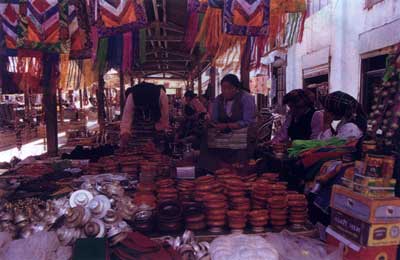 A crack in the wooden bowl is regarded as a sign of bad luck, and the bowl must be replaced. Now that china bowls have become popular, every family uses them as spares for guests. If the edge of a china bowl is clipped, it is also regarded as bad luck and the bowl can no longer be used, especially by the guests. They particularly avoid drinking tea from a cracked bowl in the early morning, and if anyone should do this accidentally and believes in this taboo, he or she will stay at home the entire day just to avoid calamity. Tibetans, especially travelling artists and lamas, often take their own wooden bowls with them when they travel. They usually carry the bowl in a pocket in the front of their sheep or goatskin or polu woolen robes. An average wooden bowl is cheap but of good quality, and the common people can afford it. It is very important to have one's own bowl. The wooden bowls of the ballad singers are the largest and can hold 2.3 kilograms of buttered tea. Whenever the ballad singers perform in the open at fairs or in markets, they place their wooden bowls beside them, so listeners can toss in their tips. So the wooden bowl, you see, can serve an additional function, to hold money or other things. Lamas also use wooden bowls. People who know the monasteries well can tell which monastery the lama is from by the shape of his bowl. The iron-club lamas who command very high position in the monasteries always move the bowl from one hand to the other playfully, which is quite dazzling. In religious meetings when the iron-club lama keeps order, his wooden bowl is an emblem of authority that is used to knock the heads of those who do not accurately observe the ritual procedures, and they dare not respond. In the old days, the clergy and laity officials making obeisance to the Dalai Lama in the morning were usually awarded three bowls of buttered tea. When a Tibetan dies, his or her family will fill the wooden bowl he or she has used with buttered tea and place it before the corpse. On the seventh day after the celestial burial, a ceremony during which the dead is offered to birds of prey so that the person's spirit can fly into heaven, the family as well as relatives and friends follow the funeral master to the bank of the Lhasa River. In the ceremony, they lay the wooden bowl the dead person used in his or her life time before him or her and repeatedly fill it with tea to wish the dead person's spirit a safe voyage. Finally, they pour the tea out of the wooden bowl, clean it and give it to the funeral master. After that, the bowl belongs to the funeral master. One of the rules among the burial customs is that if the family wants to keep the dead person's wooden bowl for a memento, they must buy it from the funeral master. Wooden bowls are produced in both the Tibet Autonomous Region and Deqen in Yunnan Province. In Tibet, Nang County and Zayu County in Nyingchi Prefecture, Gyaca, Lhunze and Cona counties in Shannan Prefecture and Gar in Ngari Prefecture all produce wooden bowls. The Chaya wooden bowls produced in Conag and the Duishiu wooden bowls produced in Gar are the most famous. These wooden bowls are made of the roots or stumps of trees. The finest wooden bowls are worth as much as 10 yaks. |
