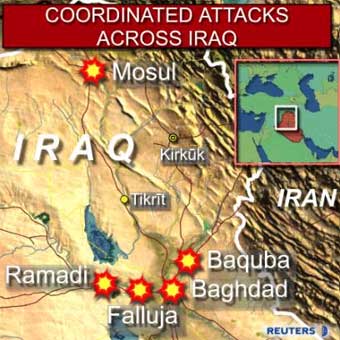 Guerrillas struck in Baquba, Falluja, Ramadi, Mosul and Baghdad, wounding more than 250 people in an intensification of a bloody campaign by Iraqi rebels and foreign militants. Three U.S. soldiers were killed.