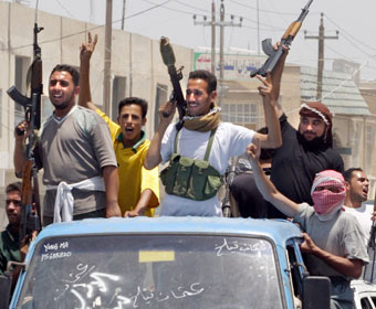 Many of the fighters wore yellow headbands bearing the name of a Muslim militant group "Saraya al-Tawhid and Jihad" (Battalions of Unification and Holy War). They handed out leaflets warning Iraqis not to "collaborate" with Americans.