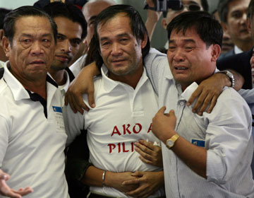 An unknown truck driver until his abduction two weeks ago, de la Cruz has become a high-profile symbol of the 8 million Filipinos working overseas to support their families back home. "We have prepared a welcome party for Angelo de la Cruz," said Mark Lapid, governor of the driver's home province of Pampanga, north of the capital. "He will be given a hero's welcome not only in his village but by the country." By bowing to the militants' demands, Arroyo appears to have calculated that she had more to lose from a popular backlash against de la Cruz's execution than from a deterioration in ties with the United States.
