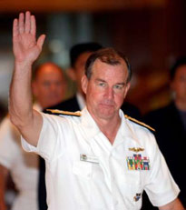 Admiral Thomas Fargo of the U.S. Pacific Command waves as he leaves a hotel in Beijing, July 23, 2004. [Reuters]